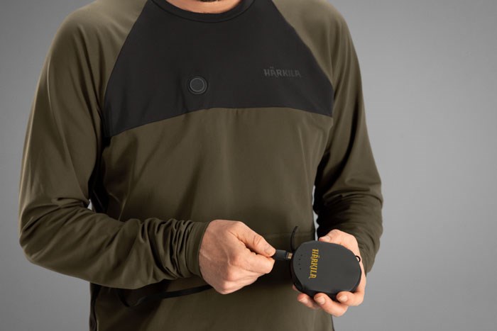 T-shirt med lång ärm i förhållandevis åtsittande modell. På de mest köldutsatta områdena som bröstet, mellan skulderbladen och i ländryggen sitter insydda värmemembran. Membranen kan ställas in på 35, 43 eller 50 grader C med hjälp av en tryckknapp på bröstet. Värmemembranen är flexibla och kan vikas ihop tillsammans med det plagg som de är insydda i. T-shirten kan utan problem tvättas i maskin.