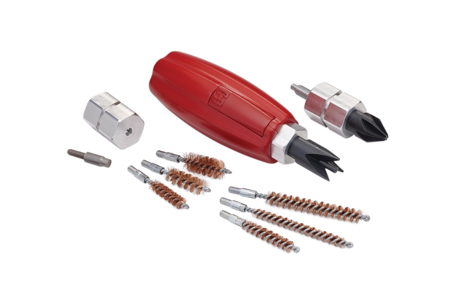 • 3 dual-sided chucks; chamfer/deburr tools; large and small primer pocket cleaners; and neck brushes for the following calibers: 22 cal, 25 cal/6mm, 270 cal/7mm, 30 cal, 35 cal/9mm and 45 cal.