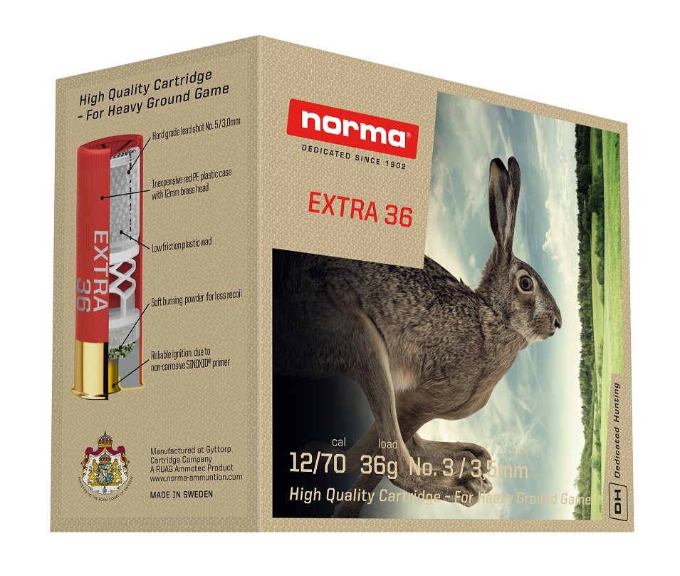 Norma Extra 36 12/70 US3. Lämplig vid jakt på hare och räv.