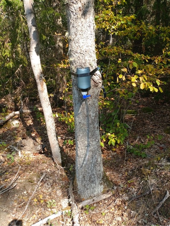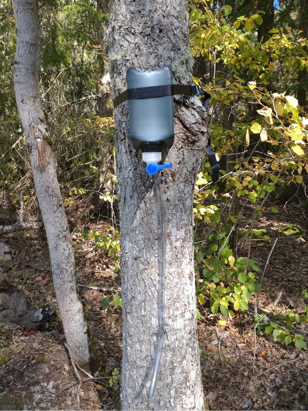 i söderläge på trädet så tjäran värms upp av solen. Slangen fästs