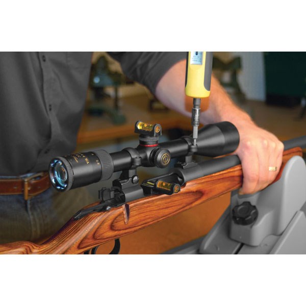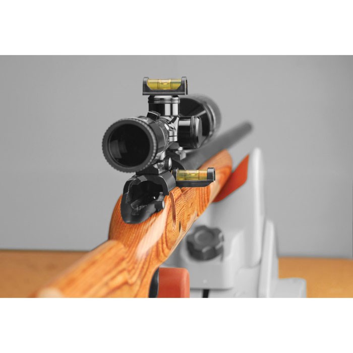 Två stycken "vattenpass" får att få låda och kikarsikte i rätt nivå. Den ena passar i dom flesta lådor (rails) men annars uppe på vapnet (toppen).